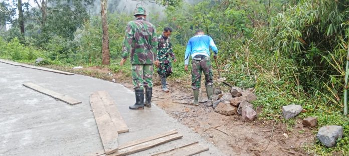 Kondisi jalan yang terakhir dikerjakan di titik 0 – 30 lokasi Kampung Simpang Babakan Garut, Desa Cipelah, Kecamatan Rancabali, telah kering dan siap digunakan. Pada Jumat (06/03/2026), anggota Satgas TMMD bersama masyarakat terlihat melakukan pembersihan jalan dan pengambilan papan bekisting.